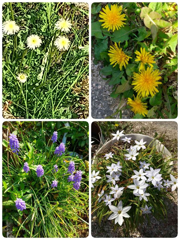 家の前の白タンポポやっと、花が開きました。黄色タンポポ、ムスカリ、花ニラ🌸🌸🌸☘️