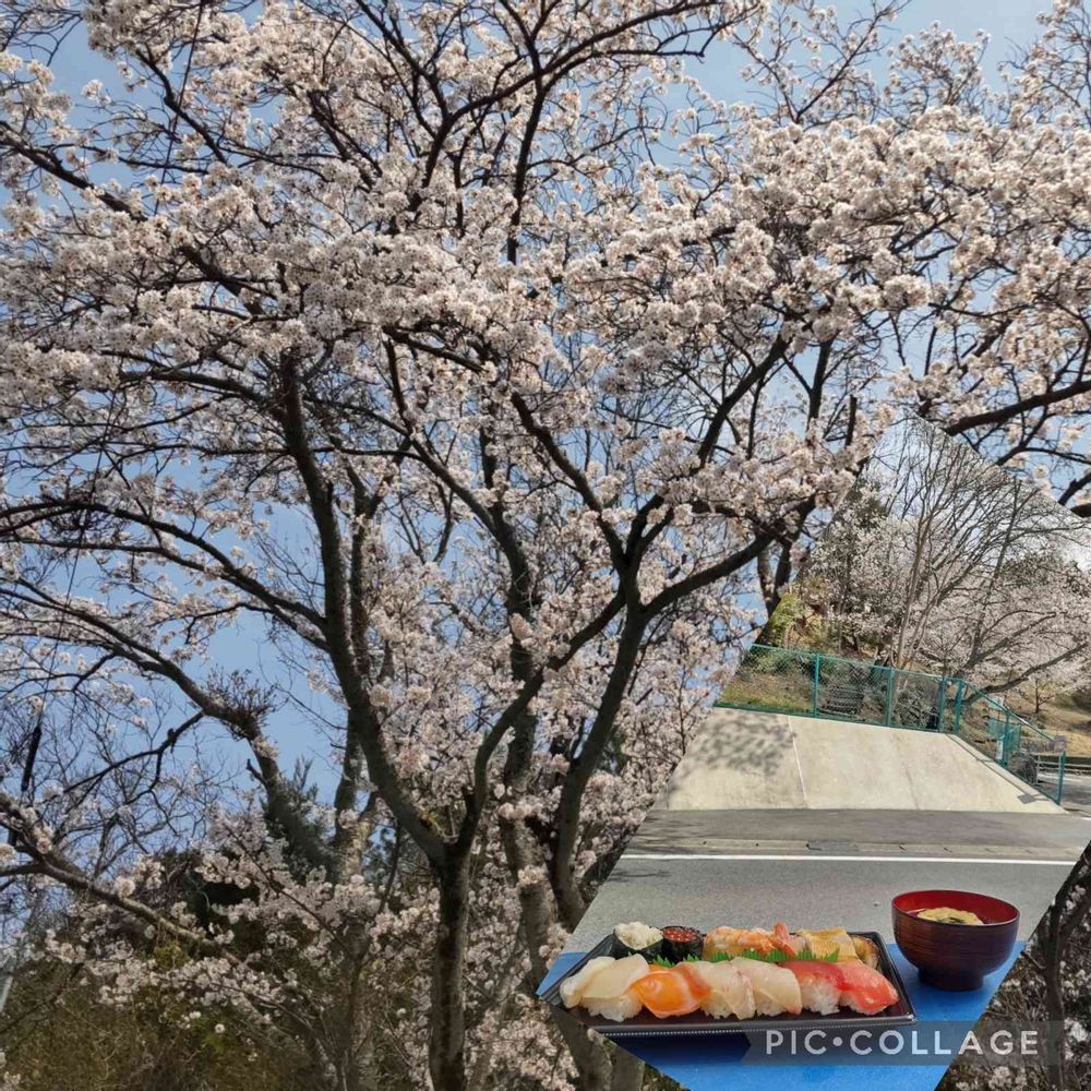 お昼はガレージでスシローのお寿司を食べながらお花見しました🎶