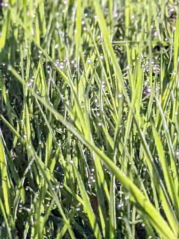 朝 アプローチの草に朝露がキラキラ✨✨✨✨✨