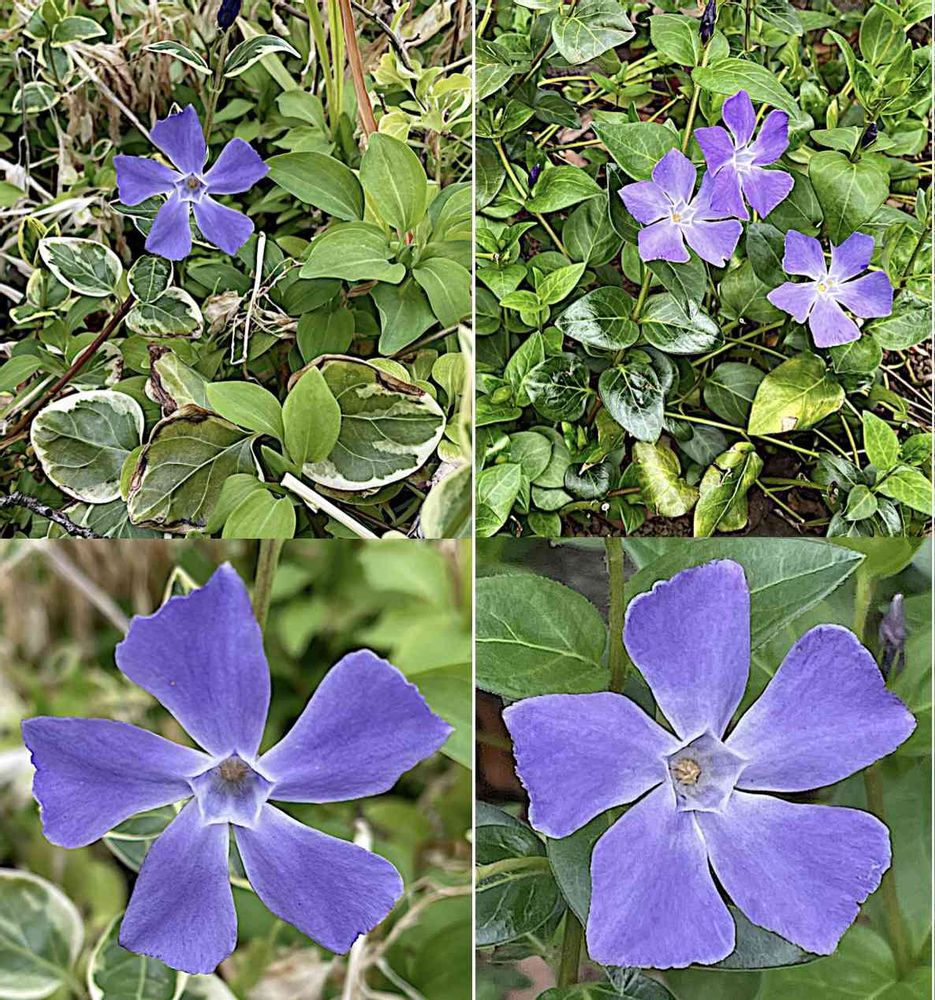 カタバミさんのお出かけ先,ツルニチニチソウ(蔓日々草),/進む春、1つは斑入葉同類2つの紫5弁花/の投稿画像