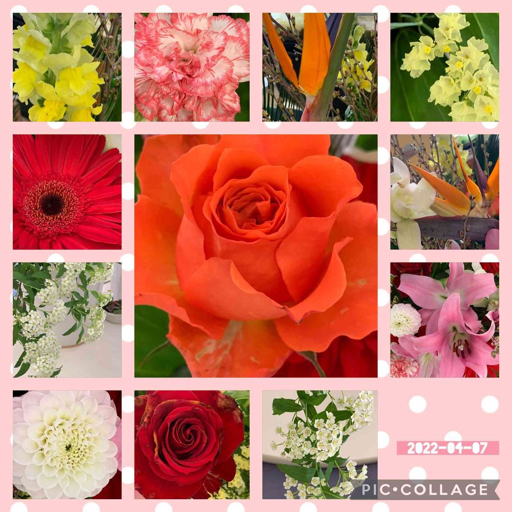 ダリア、バラ、極楽鳥花、コデマリ、スターチス、ゆり、ストック、カーネーション、サクラ等。