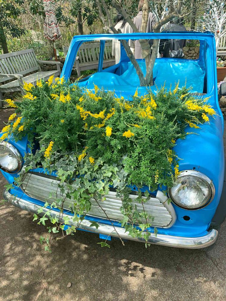 可愛いブルーのミニに飾られたエニシダとアイビー