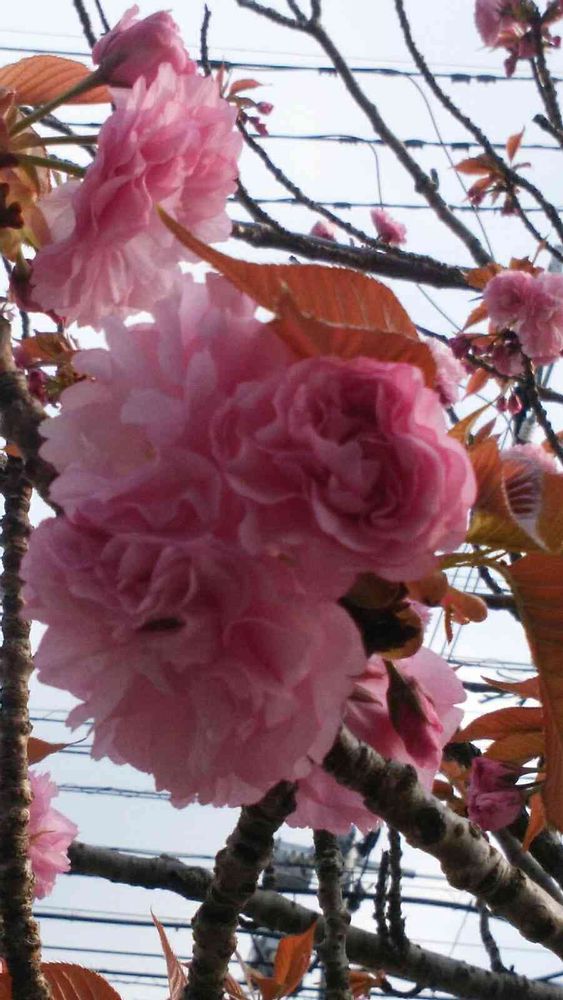 ボタン桜こと八重桜咲いてました4/8。ボンボンか毬みたいな感じに咲いていた。もっと花増えるのかな