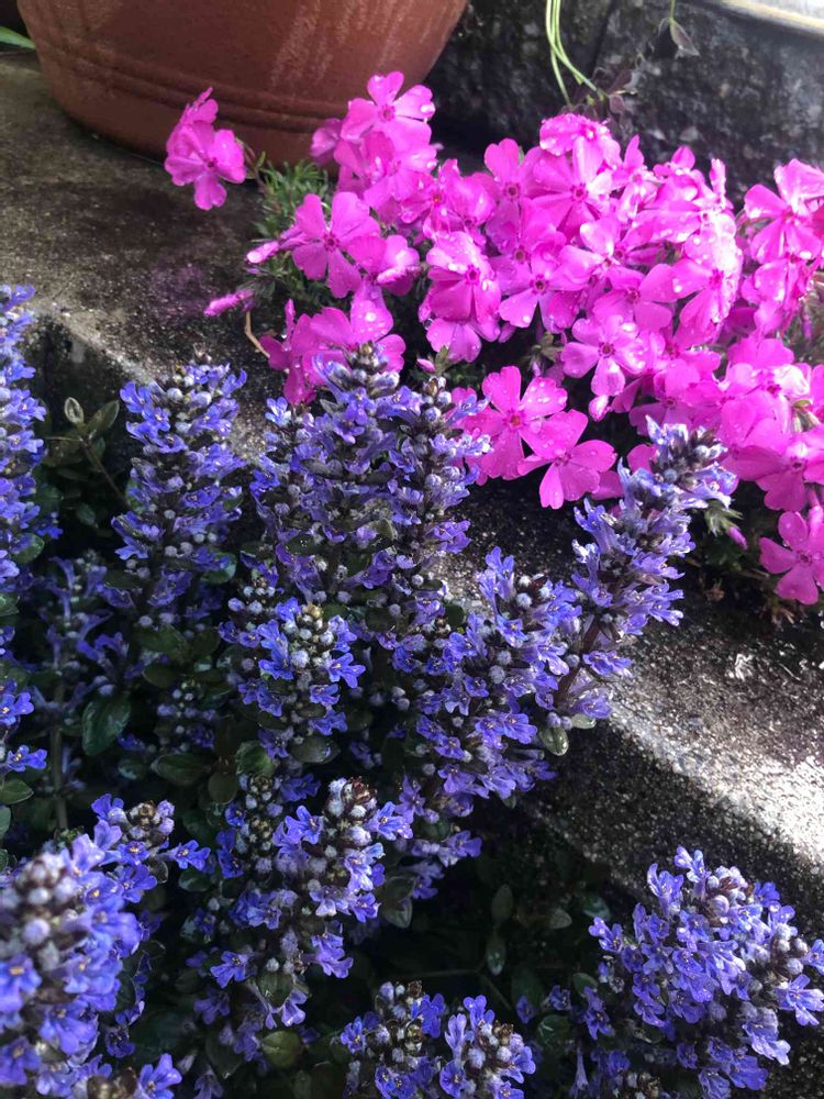 様 こんばんは♪お久しぶりです😊舅の芝桜と鬼嫁のアジュガのコラボです(笑)