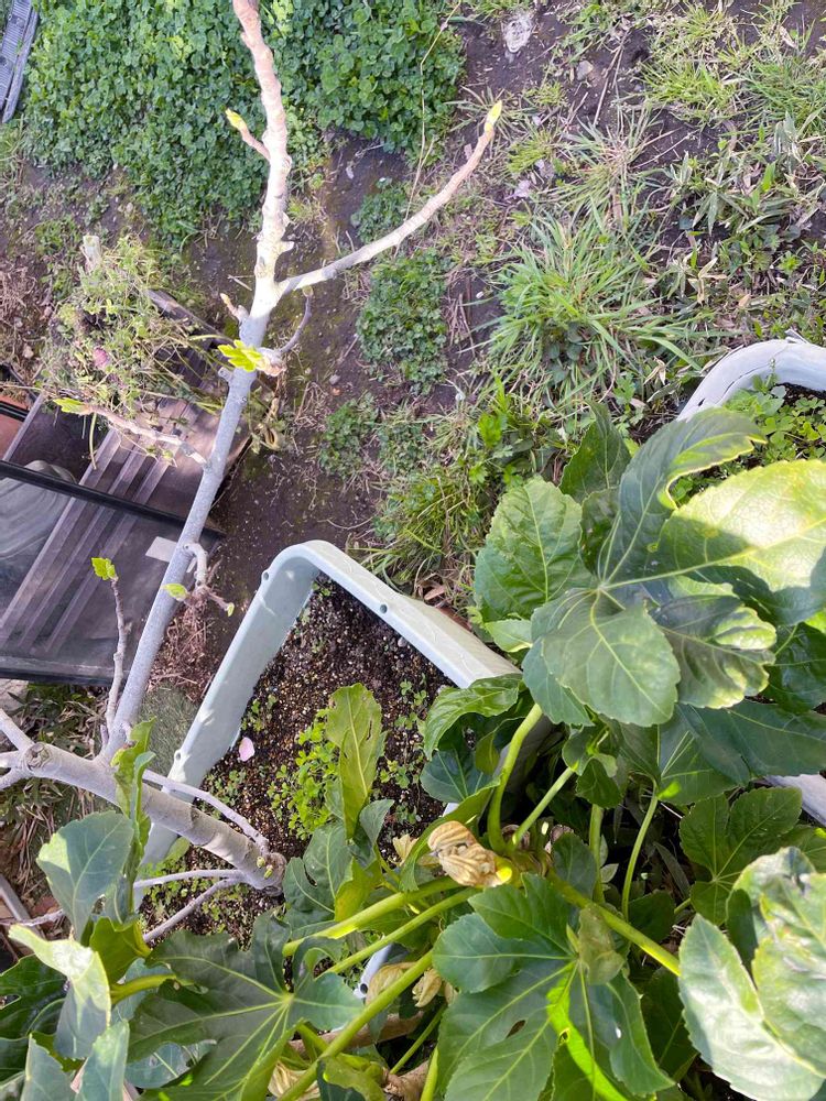 令和4年4月8日(金)晴れ☀️ おはよーヾ(๑╹◡╹)ノ"ございます 小さい庭で朝の見廻りしています picはヤツデに花芽を見つけたのでイチヂクの芽と写しました📸