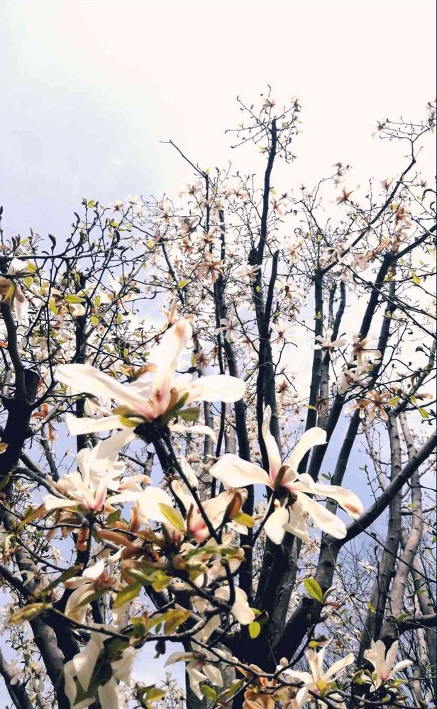 ポカポカ陽気が続き、握り拳のような固い冬芽に覆われた蕾が綻び始め、青空の下で喜びいっぱいに花開く四手辛夷。