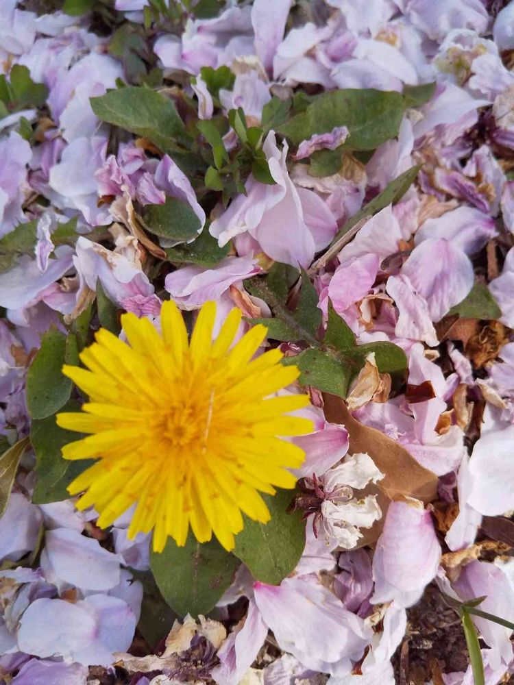 桜吹雪舞い散る草むらに…ピンクの花びらに埋もれて幸せそうな…タンポポさん!