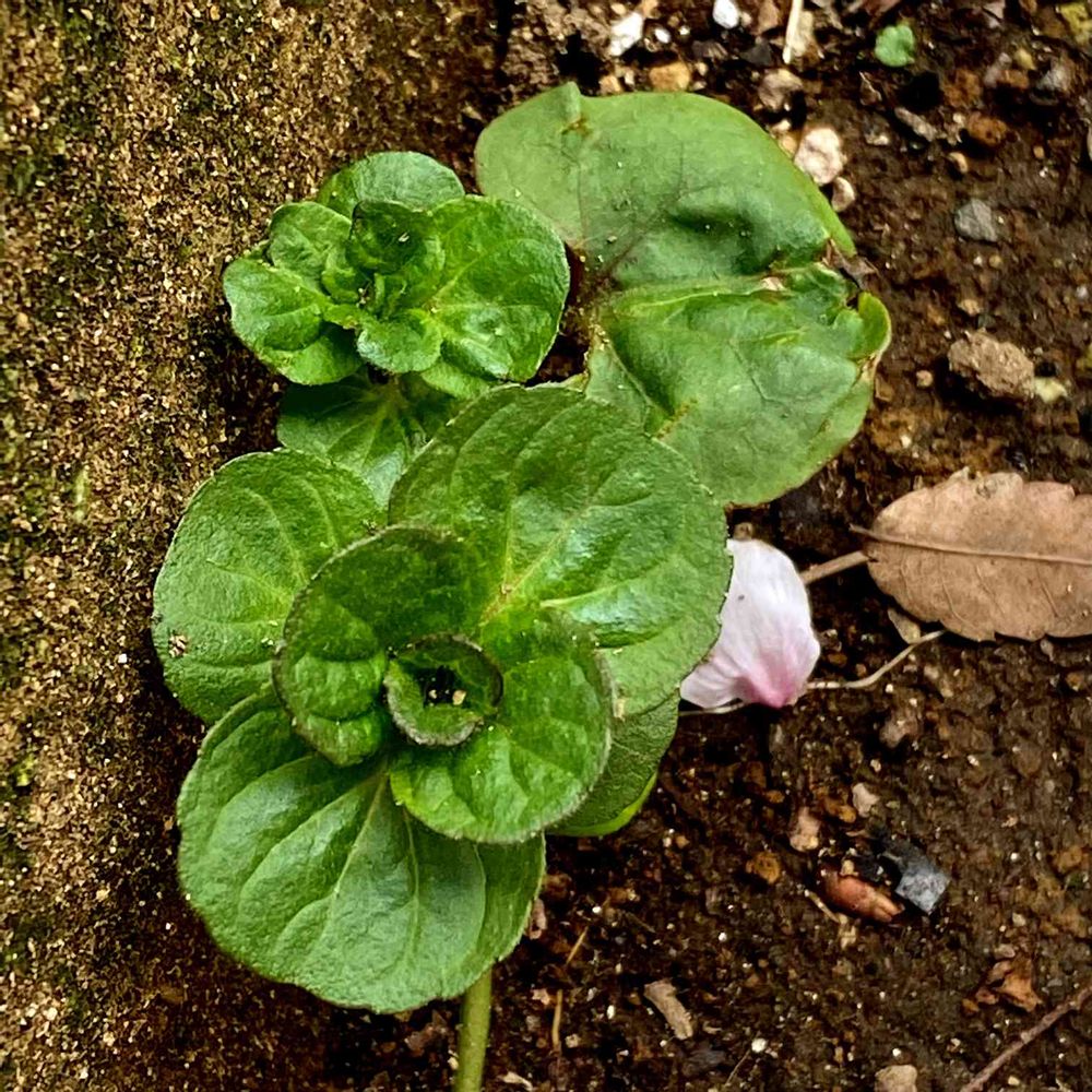 オレンジミントの丸い新芽が好きです。去年植えたところから、かなり離れた所に出てきました。
