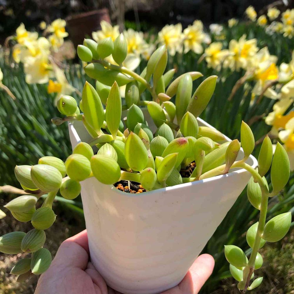 去年の秋かな⁈冬かな⁈ダイソーでカピカピになってたのを連れ帰って植え替えた子🍀アーモンドネックレスかな⁈と思ってお世話してたけどお店でそっくりな子に"京童子"と表記…勉強になりました✨新芽🌱ももりもり粒が大きい⤴️連れて帰って良かったです💕