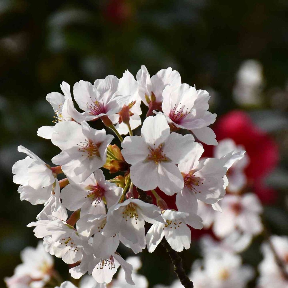 【研究学園の花々】2022年4月3日、東光台運動公園では、椿を背景にソメイヨシノが華やかに咲いていました!