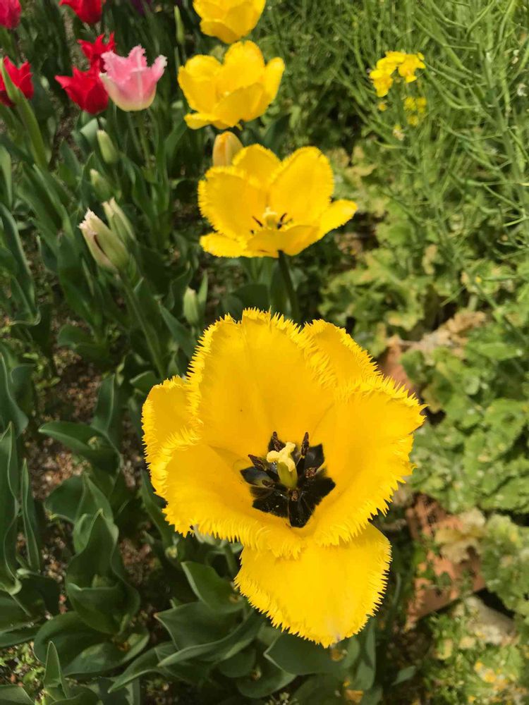 駅前の花壇に、花びらの縁がギザギザのチューリップが満開です。