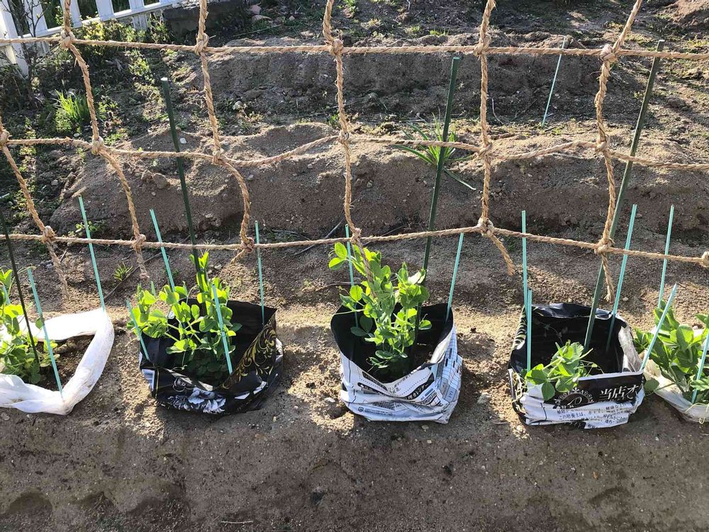 裏庭の畑に春一番に植えました。大好きなスナップエンドウ!