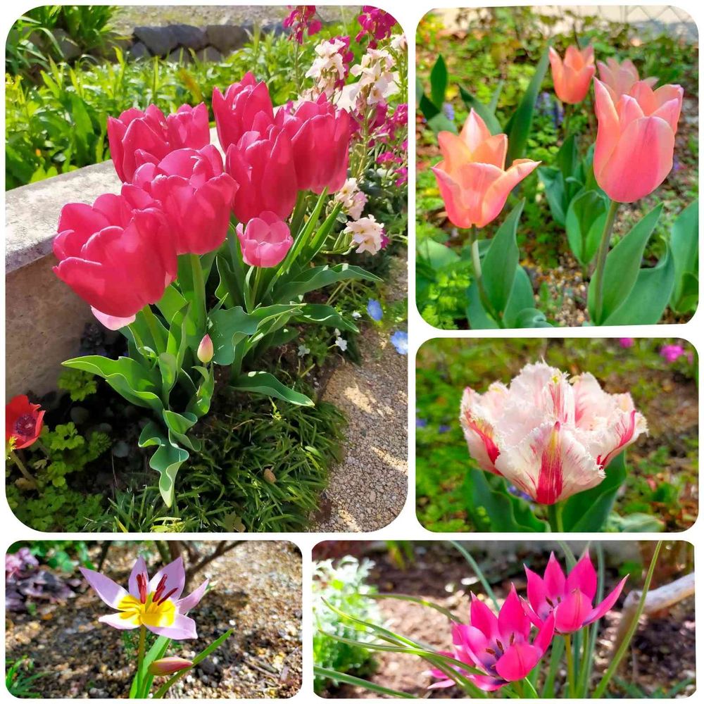 下段2種類のチューリップは原種で、毎年お顔を見せてくれる良い子達💖下段左のイエローピンクの子は、2年間葉だけでしたが、今年初めて花が咲きました☺こんなカワユイ子だったとは〜💕