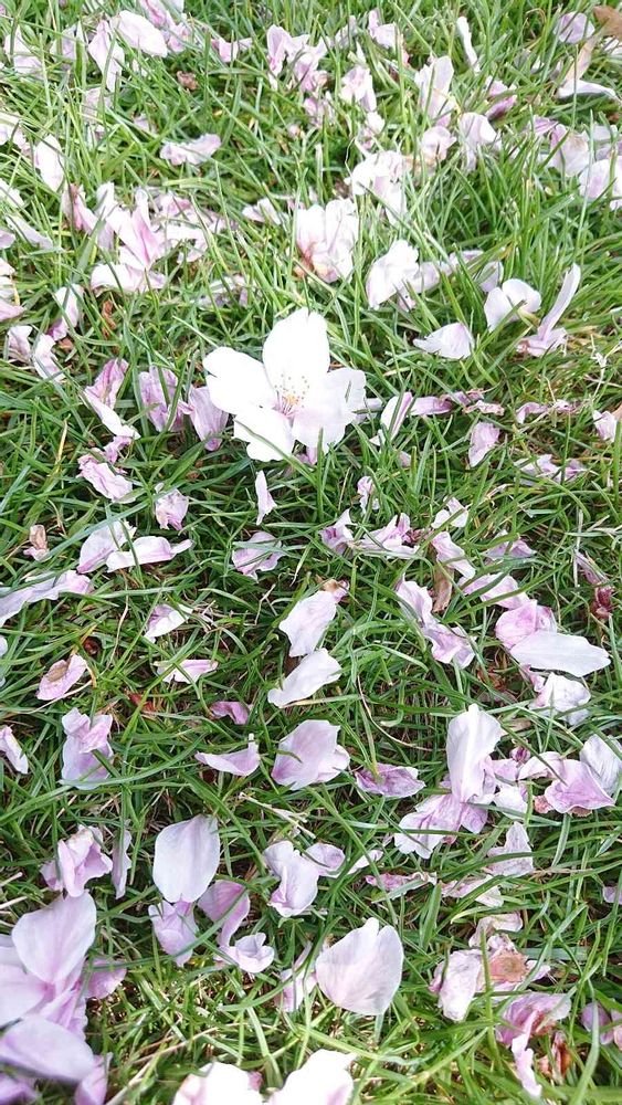 アスファルトだと花びらが定着せずにヒラ~っと舞うんでしょうけど、下が芝生だったから、桜の花びらを包み込むように花びらが均等に綺麗に羅列していたのには感動でした🥺