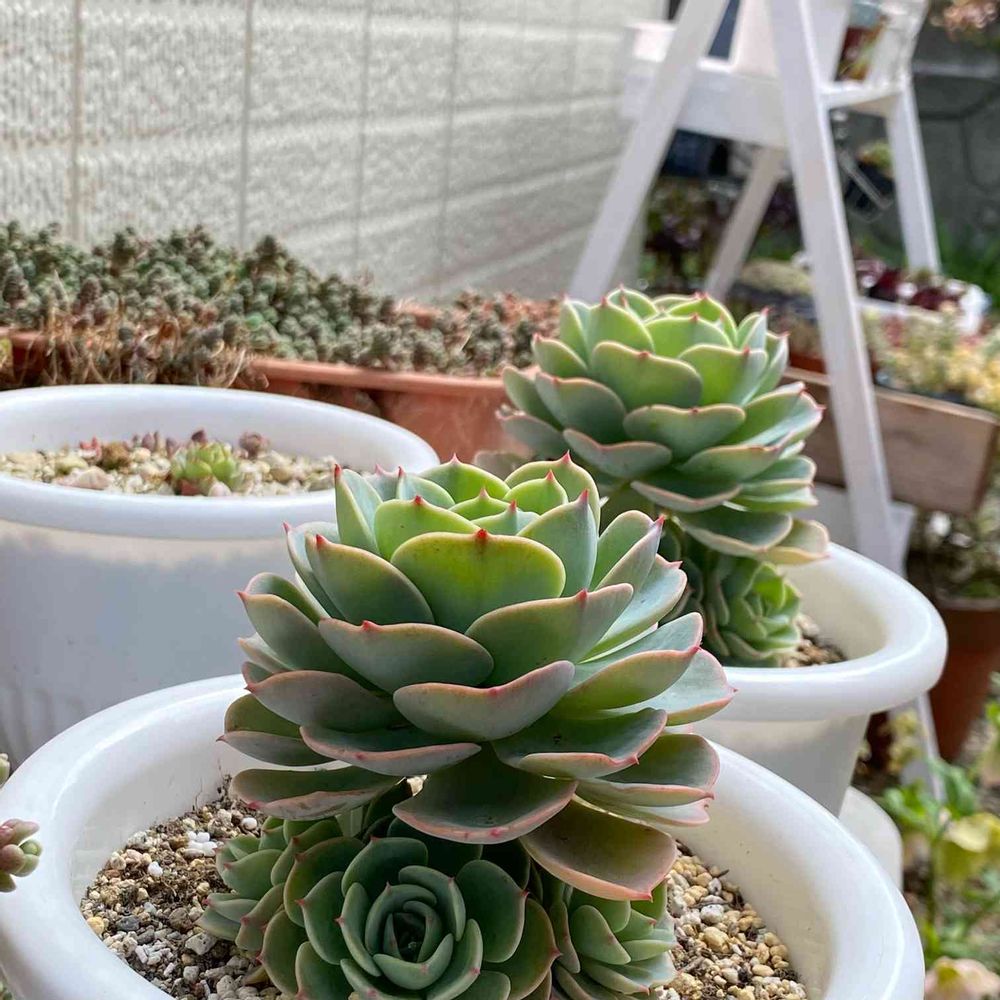 元の親は東の軒下気味の雨ざらし、子は南の木の下、そして孫がストロベリーポット‼️親はしまり気味の葉数多め。孫は開き気味だけど、鉢がでかいから親よりデカいかな😅