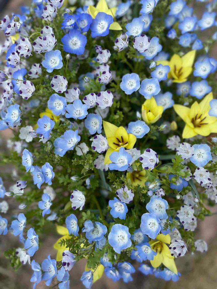 黄色いチューリップが咲いて、ネモフィラとの色合いがとっても素敵ですね💜💙💛