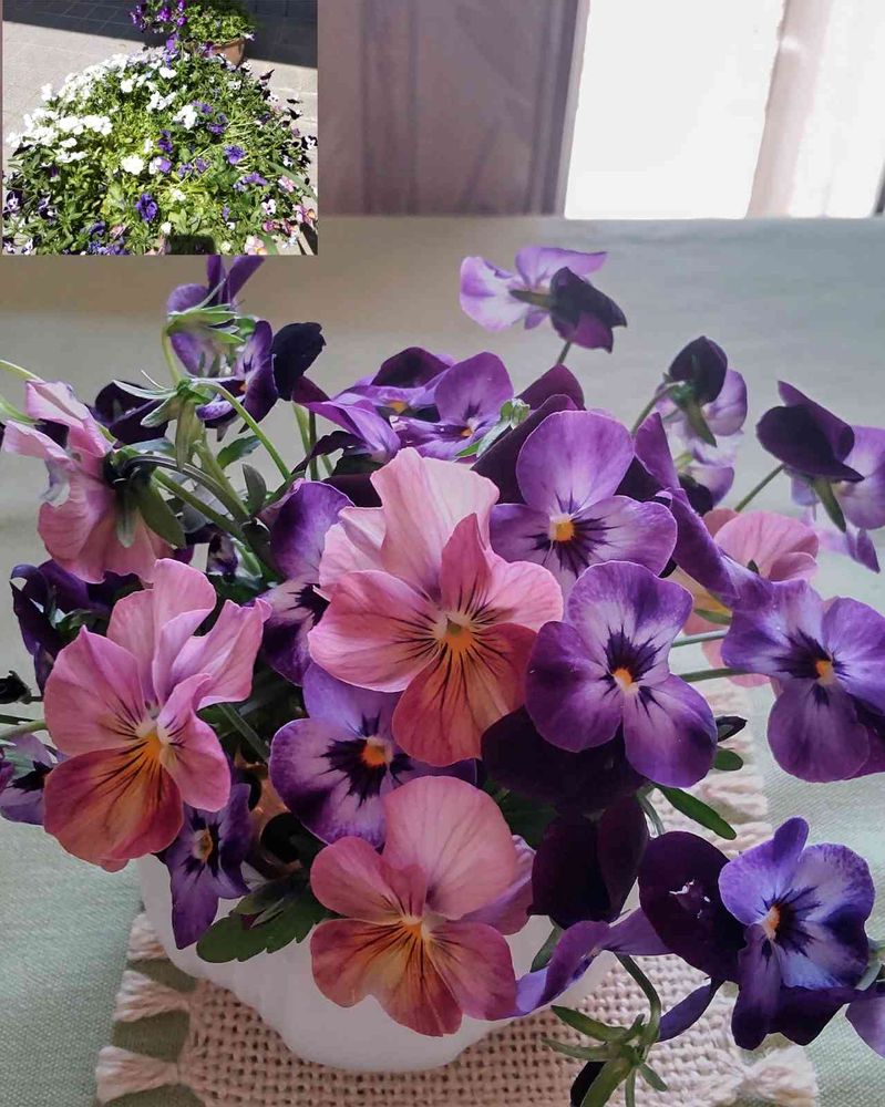 鉢植えのビオラが伸びてべちゃ~と広がってしまいましたのでカットして切り花に。