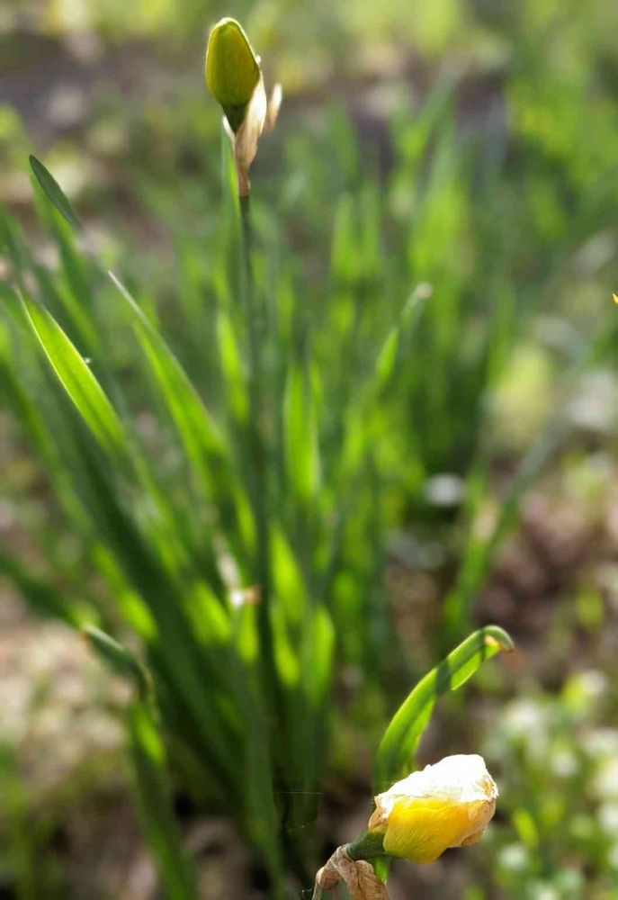 ずんぐりした姿でずっと気にして来た手前の水仙の蕾…