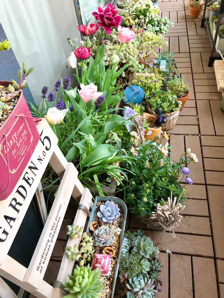 ベランダには、たくさんのお花や多肉ちゃんが並んでますね〜🌸🌱