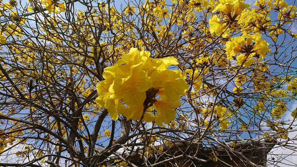 近所で見かけるようになりました。コガネノウゼンとも呼ばれるシソ目ノウゼンカズラ科の広葉樹。ブラジルの国花だそうです。日本では主に南国で見られるようです🌻