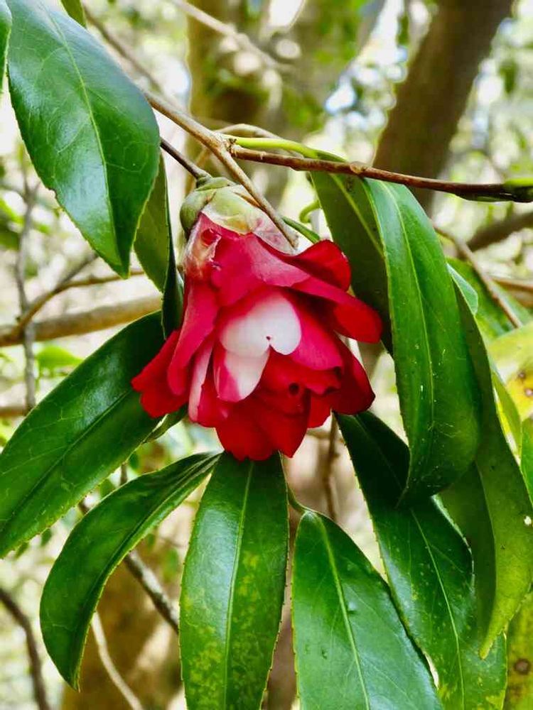 伊賀上野城から少し下った場所にあるクジャクツバキ。
