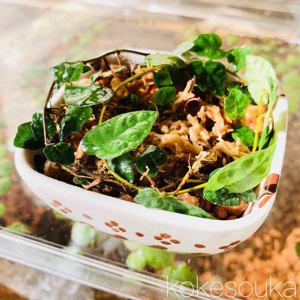 ヒメイタビは、苔との相性も良いクワ科のツル植物。樹皮や石垣、地面などを匍匐して広がります。