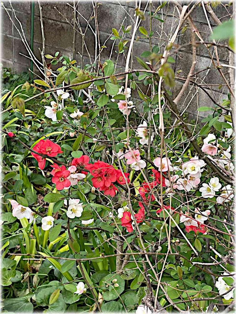 カタバミさんのお出かけ先,ボケ(木瓜),/ここに観る、赤と白、白の赤斑混じり合う花木々/の投稿画像