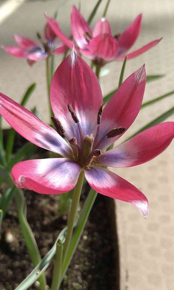 チューリップ🌷開き過ぎちゃいました。夜は花を閉じるけど、午前中の陽射しでみるみる間に開花。原種に近いミニ🌷です。