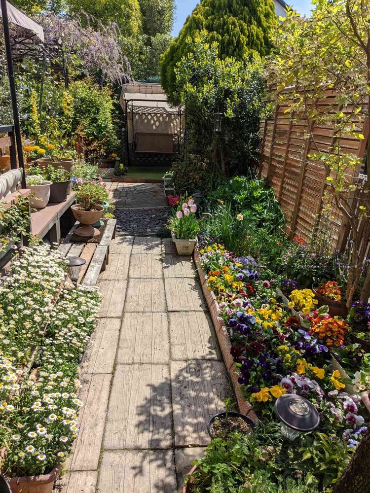 通路の両側に花壇、奥には藤棚ため息がでそうにすてきです。藤の花の咲くころはそこでティータイムですね💞