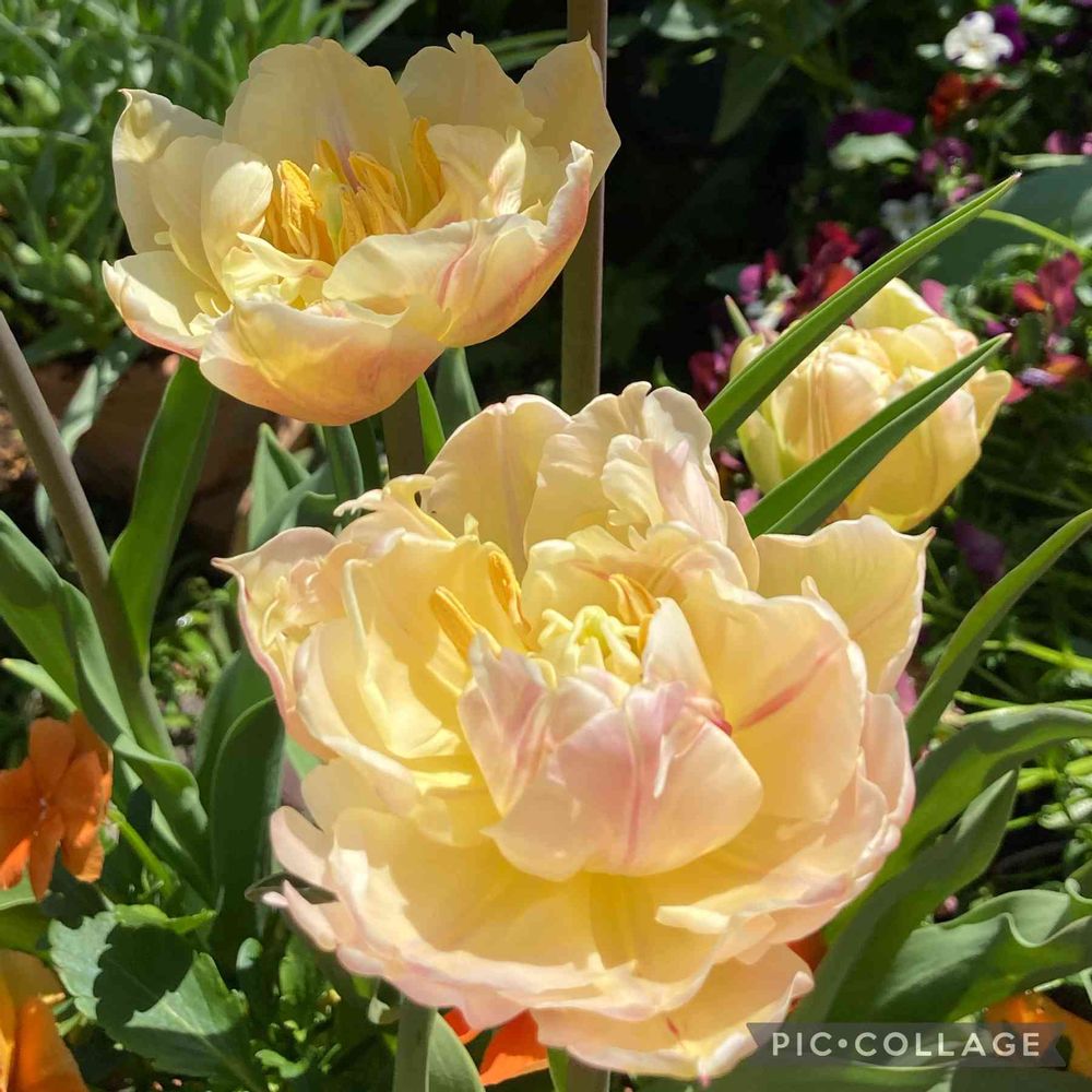 クリーム色にピンクが少し入る八重咲きのチューリップです。