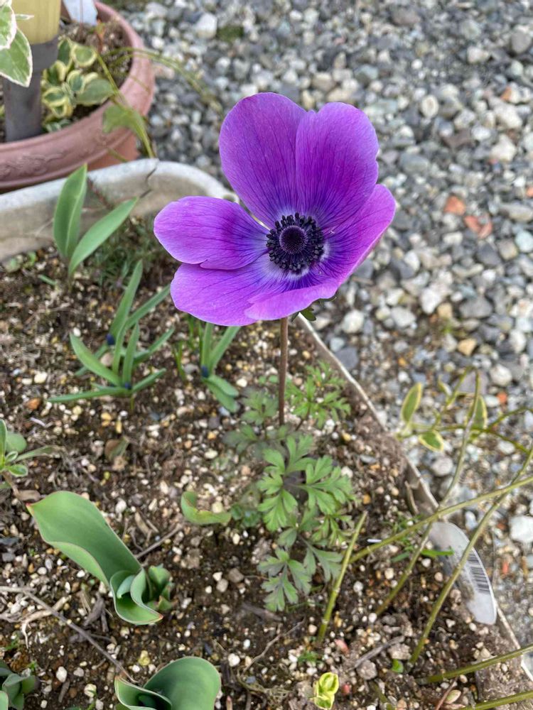 おおアネモネのお花 とうとう開花でございますね。ムスカリのお花の頭もぴょこんと♡