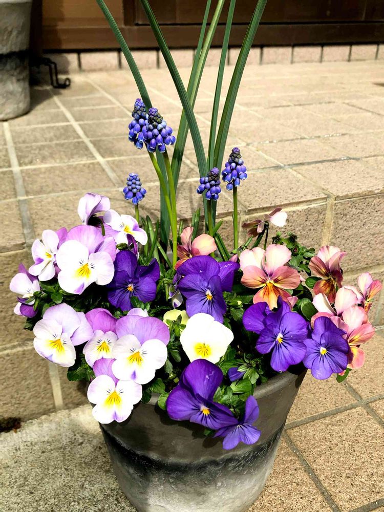 ムスカリが少なくて ちょっぴり淋しい寄せ植えになってしまいました💦