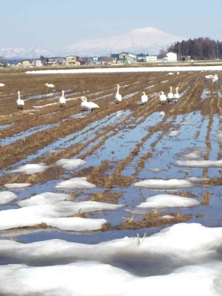今日は朝から良かったですね 良く晴れて鳥海山もみえ田んぼの雪解け 白鳥さん今日はラッキーでしたね