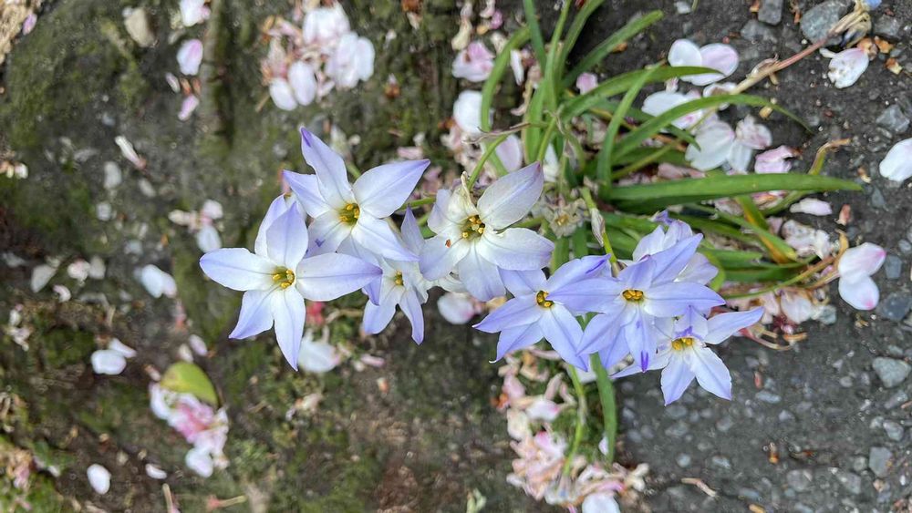 ソメイヨシノの木の下には舞い落ちた花びらとハナニラのお花☺️