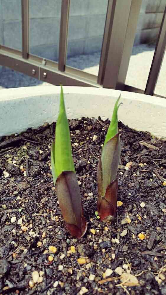ホスタ、サムアンドサブスタンス。タケノコのような芽吹きに驚きます。もう10cm!