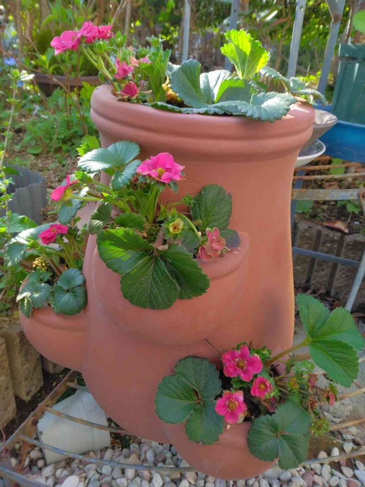 赤花苺のお花が咲いて、根元を見ると赤ちゃん苺が沢山なっていますよ🤗