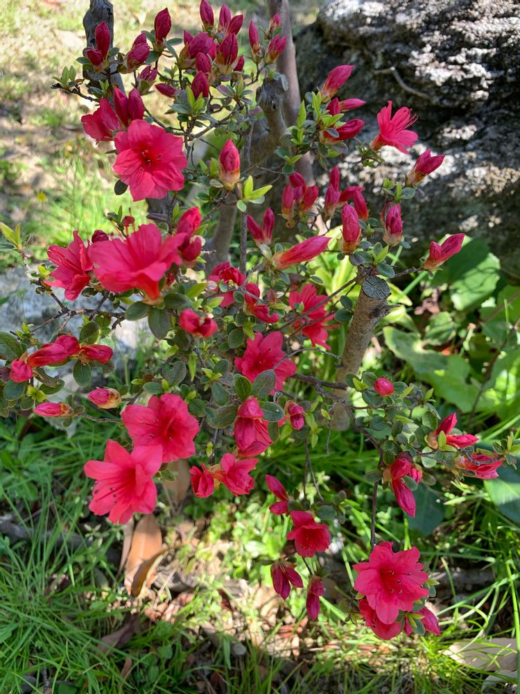 昨年、強制剪定したツツジが咲いてくれました。濃いピンク、気に入ってたので嬉しい。昨年は何かの幼虫に食い荒らされた。