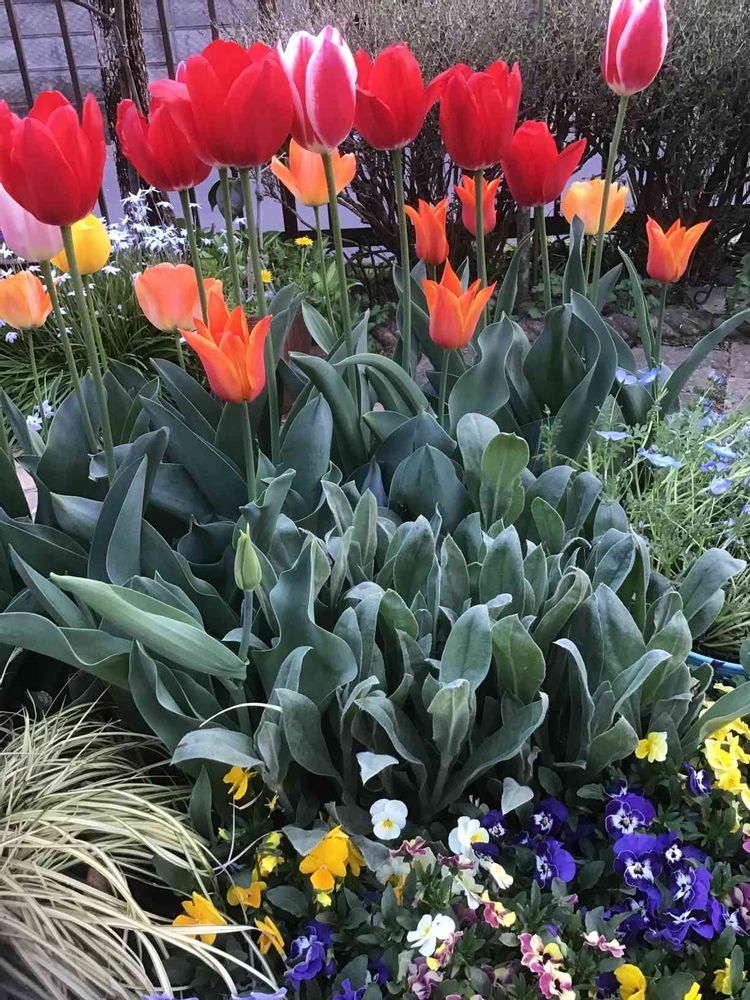 咲いていましたが、最後に ユリ咲きの オレンジ🧡色の チューリップが 、 低い所 で 咲いて 合流しました ❣️