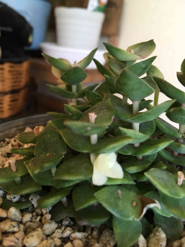 玄関に置いてますが葉も変色してきたのでダメかなぁって思ってたら今朝白い小さな可愛い花をつけてました😍