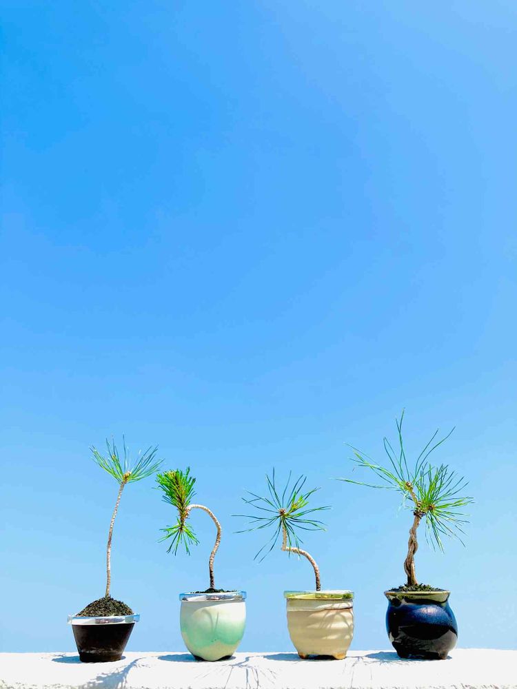 鉢は4個ですが右端の子は3本の赤松を三つ編みにして三つ子にしてみました😂