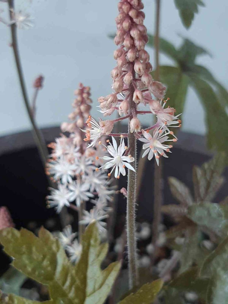 ティアレラピンクスカイロケット🚀です。白からピンク色の花穂が順番を競うかのように次々にでてきました。花期は、5月6月ですが、それ以降は切れ込みのある葉っぱを楽しめるとか…毎日愛でています。