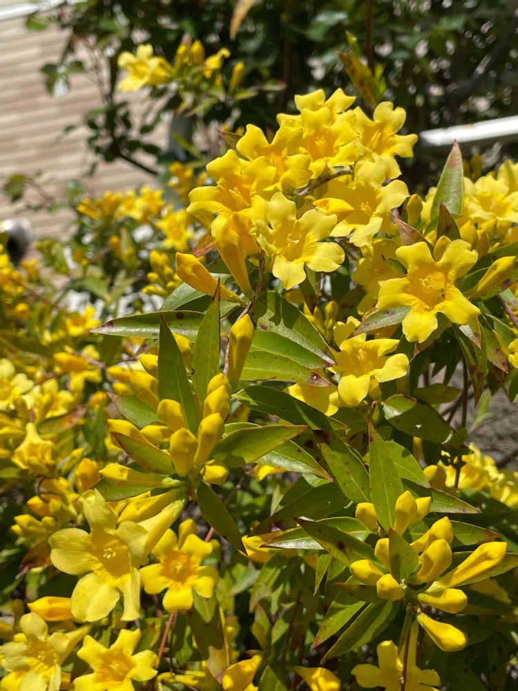 今日の午後の映像です。昨年よりだいぶ遅いですが、咲いてきました💕カロライナジャスミンのような甘い香りはないのですが、鮮やかな色で元気😃をもらえます。小さな細い茎が一本のポット苗が13年経ちフェンスいっぱいに2箇所咲いています。蕾をたくさんつけていますので、当分楽しめそうです。