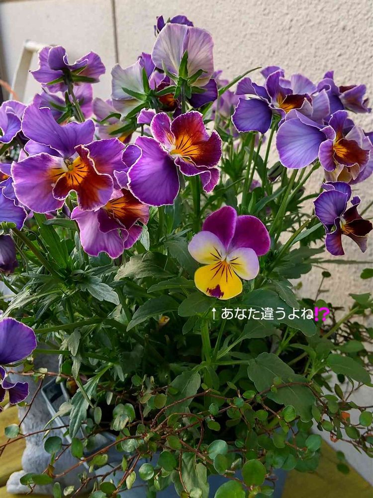 ヨコハマセレクション フレアーブルーのふりして混ざって、すまして咲いてる野良ビオラ😂 今日まで全然気づかなかったよ🤣