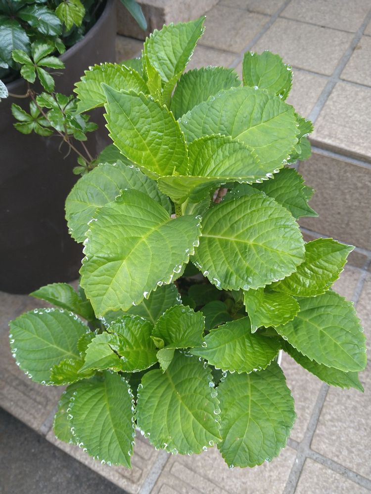 なぜか この紫陽花だけ...鉢の大きさに対して 肥料入りの水が多すぎたのかな?
