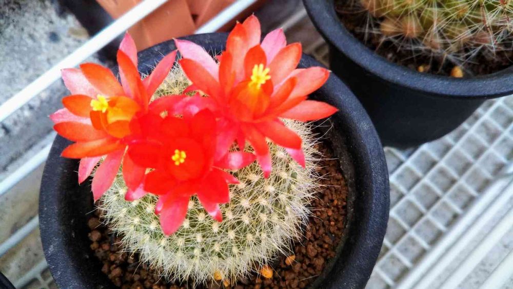 1ヶ月前に、蕾付きのコ迎えて咲きました。朱色のお花。雪晃です。このサボテンの特徴は開花したら花は閉じずに2週間位咲きつづけるらしいです。黄雪晃もあります☺️