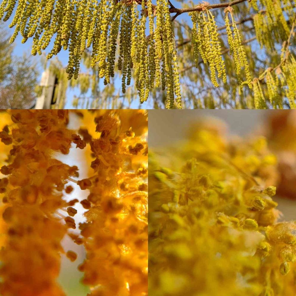 長い房の1本1本には、びっしり小さな花が咲き、開花して雄しべが出てるのが見えます。近づけた携帯は、黄色い花粉にまみれました😱