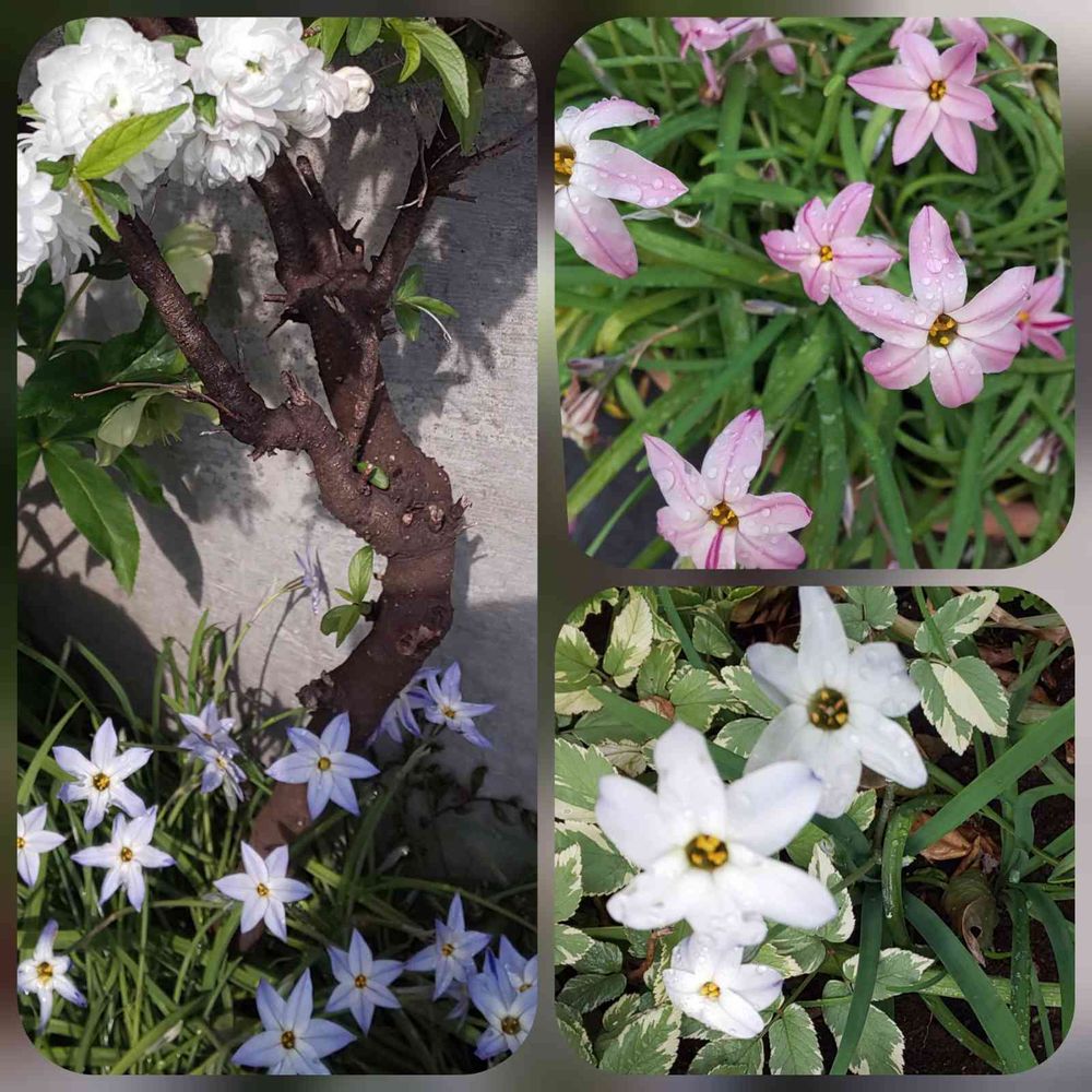 ハナニラ三色咲き揃いました。紫の所に一緒に写っているのはニワザクラの白です。