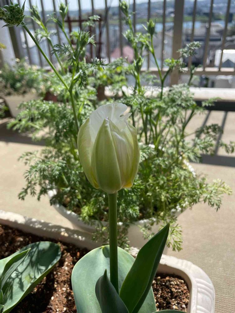 最後に咲いているグリーンと白のチューリップと友人から去年もらって種を蒔いていたオルレアとニゲラがこんなに成長しました。どれがオルレアでどれがニゲラか??わからずじまい。