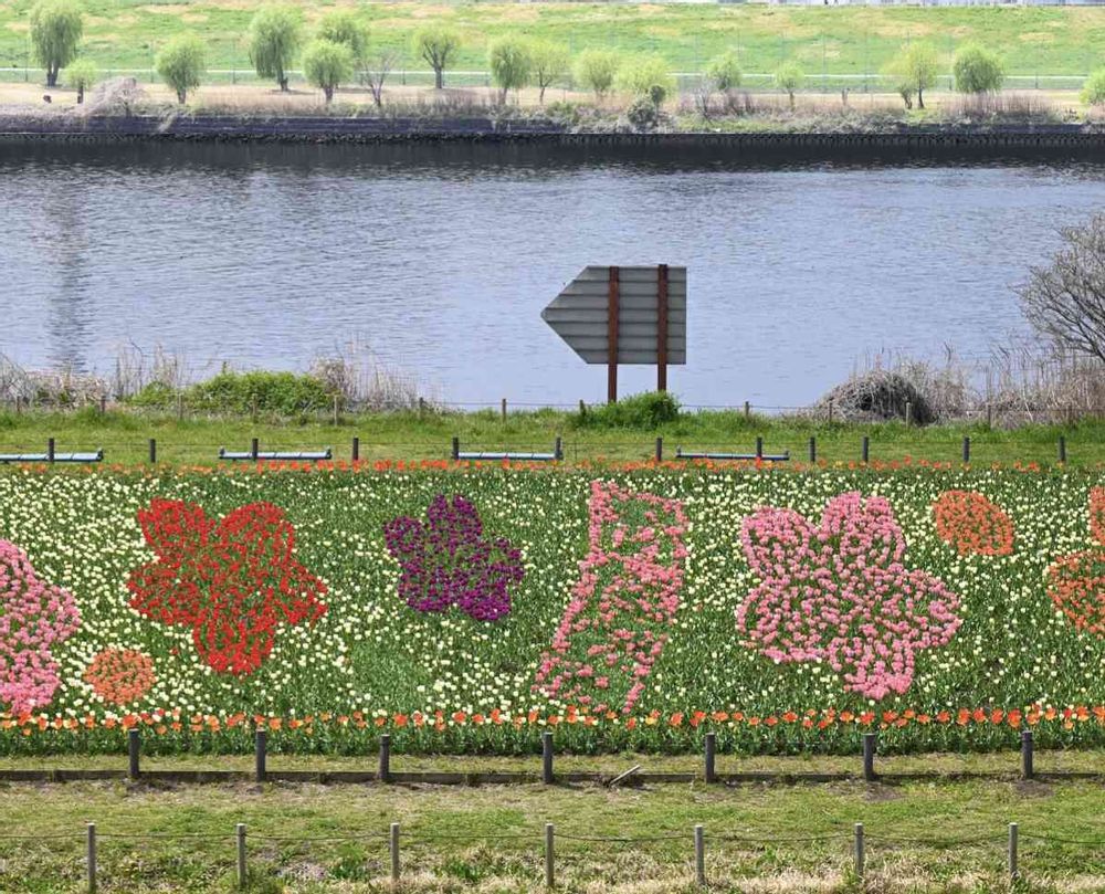 荒川河川敷にチューリップ🌷で形づくられた