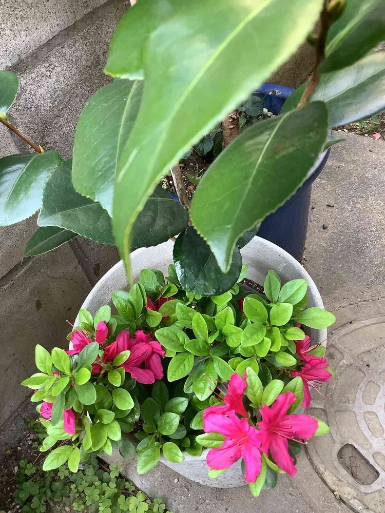 こんにちは😃椿の根元でサツキが😘これで満開です💞